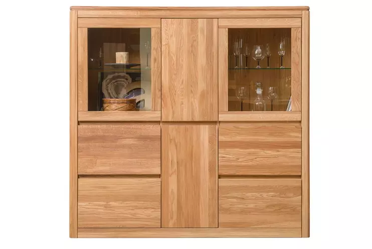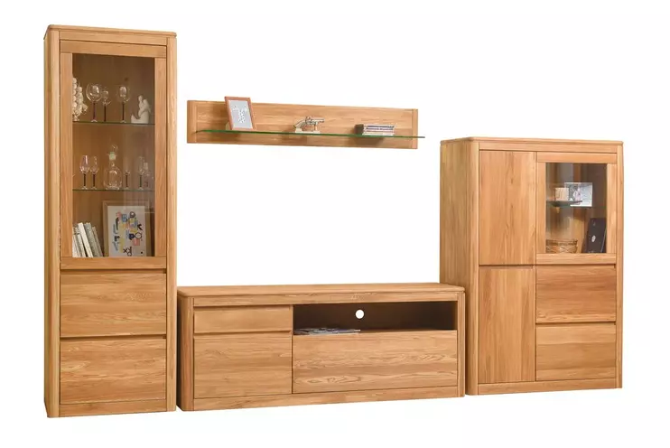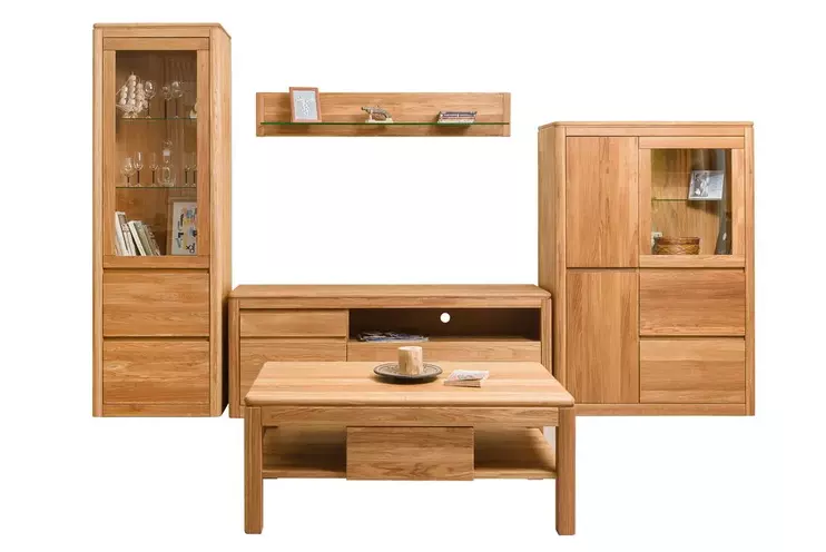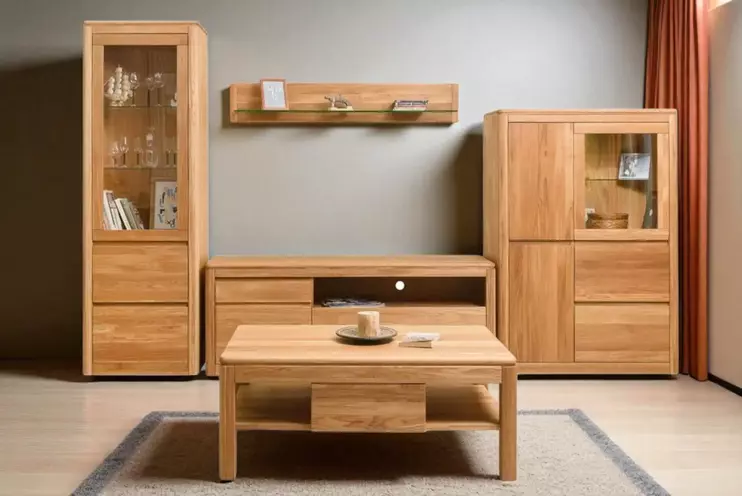 Коллекция мебели из натурального дерева «Лозанна Люкс ST» – это шкафы-витрины, тумбы ТВ, журнальные столы и настенные полки. Корпуса и фасады всех предметов сделаны из массива дуба, задние стенки из фанеры в шпоне дуба. На выбор 6 вариантов отделки – «бейц-масло», «отбеленный дуб», «дуб паркетный», «дуб венге», «темная вишня» и «итальянский орех». Под покрытием видна текстура дерева.