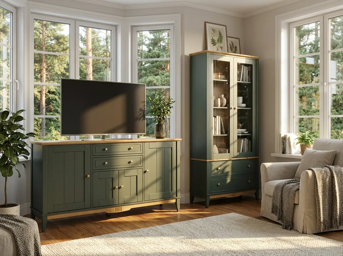 Корпуса и фасады изготавливают из массива сосны, задние стенки и днища ящиков – из ДВП. Изделия окрашивают в цвета «серый 7046/антик 24», «белый воск/антик 24», «блэк/антик 24» и «грин6020/антик 24». Выдвижные ящики оснащают направляющими частичного выдвижения, без доводчиков. Дверные петли Hettich имеют доводчики для плавного закрывания. Гарантия на изделия составляет 24 месяца.
