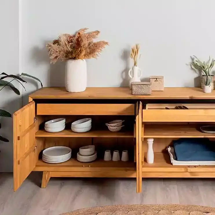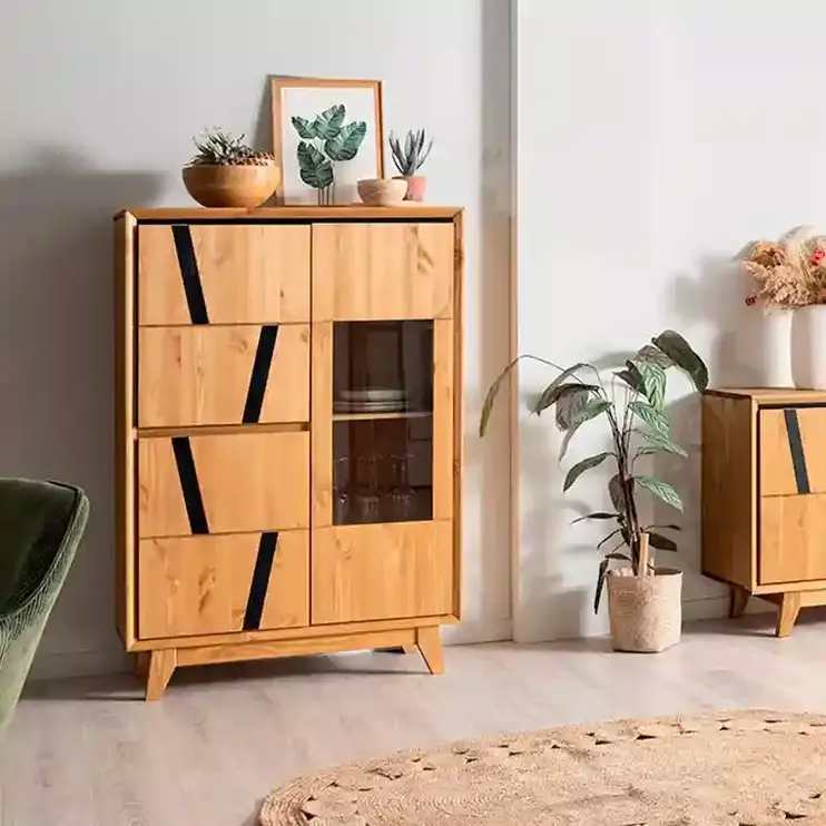 В коллекции «Мэнсон» для гостиных и спален представлены журнальные и обеденные столы, посудные шкафы и тумбы под телевизор. Всё это изготовлено из натурального дерева – массива сосны. Изделия предлагаются в отделке бейц/масло, поэтому материал имеет естественный природный вид.