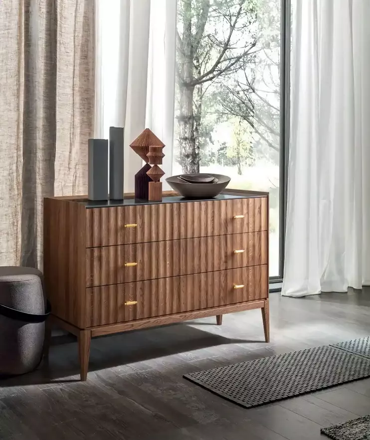 Для этой коллекции предлагается три варианта окрашивания: дуб венге, темная вишня или итальянский орех. На фасадах сделана волнообразная фрезеровка, дизайн фасадов дополняется удобными металлическими ручками золотистого цвета. Между основанием и корпусом предусмотрен зазор, благодаря этому мебель выглядит более легкой.