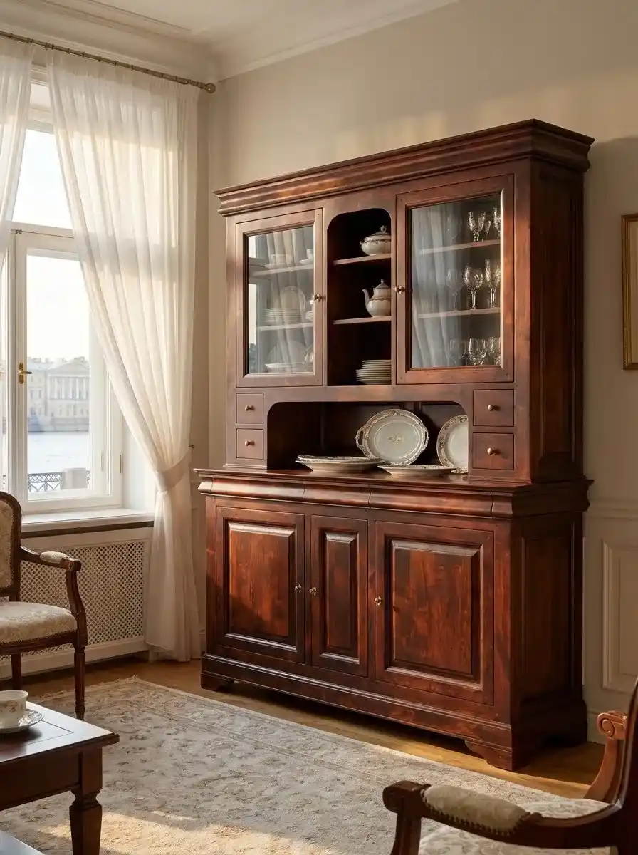 Буфет «Луи Филипп ОВ 01» станет украшением кухни или гостиной. В буфете можно хранить посуду, книги или сувениры. Он изготавливается из натуральных и красивых природных материалов – массива ольхи или массива дуба. На выбор предлагается множество вариантов отделки по таблице RAL. У буфета устойчивые низкие ножки.