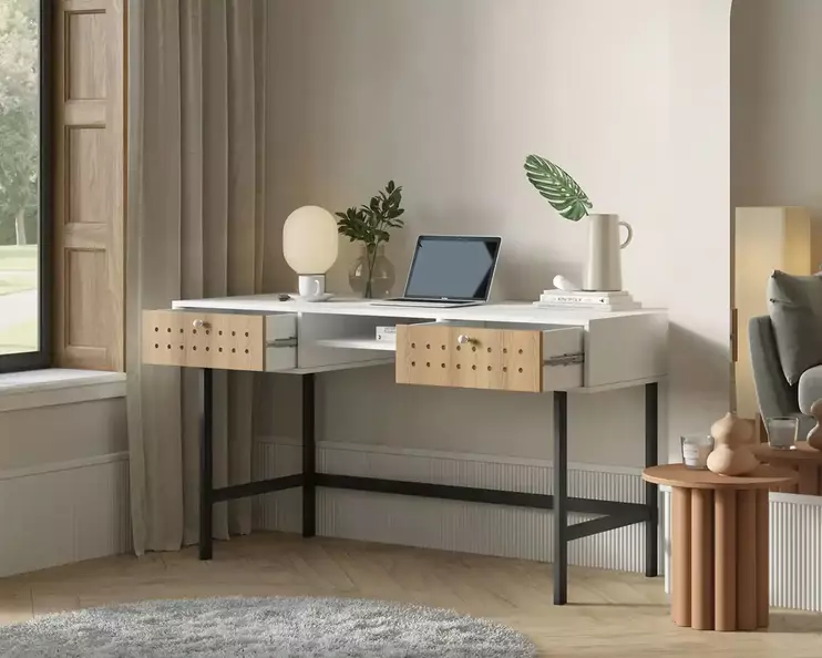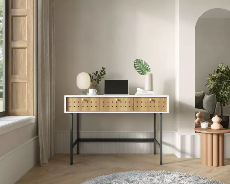 Корпуса предметов в коллекции Koto окрашены в белый цвет, фасады – в натуральный древесный цвет. Ручки и стенки ящиков также белые. Высокие ножки выкрашены в черный, поэтому в коллекции есть что-то и от стиля «лофт». На фасадах сделана декоративная перфорация.