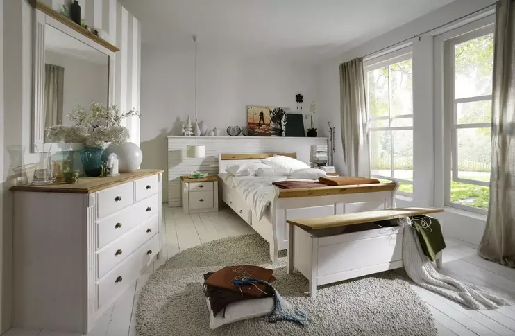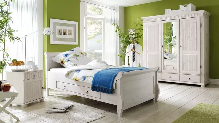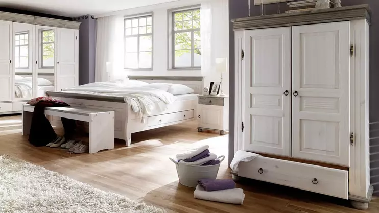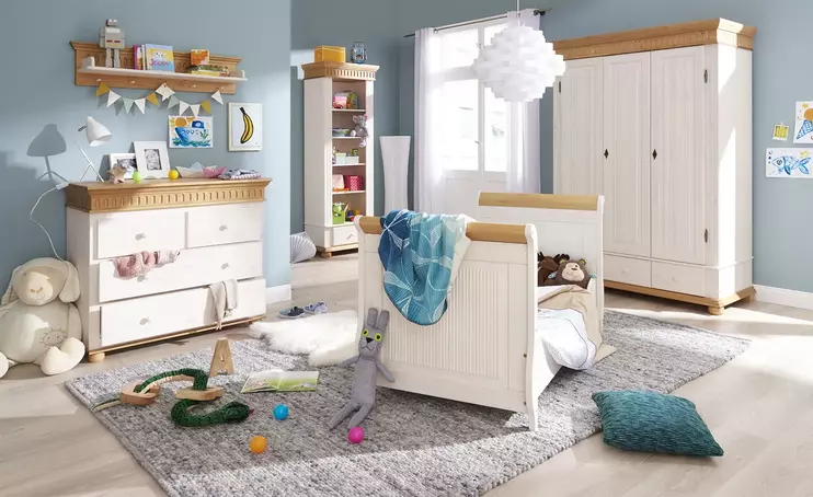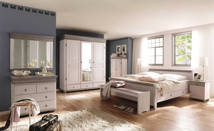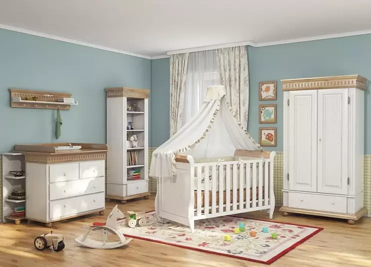 Доступно три варианта тонировки: белый воск/серый, белый воск/антик и полностью белый. Для окрашивания применяются сертифицированные гипоаллергенные красители. Фасады шкафов и столов, а также изголовья и изножья кроватей украшаются филенками и декоративной фрезеровкой.