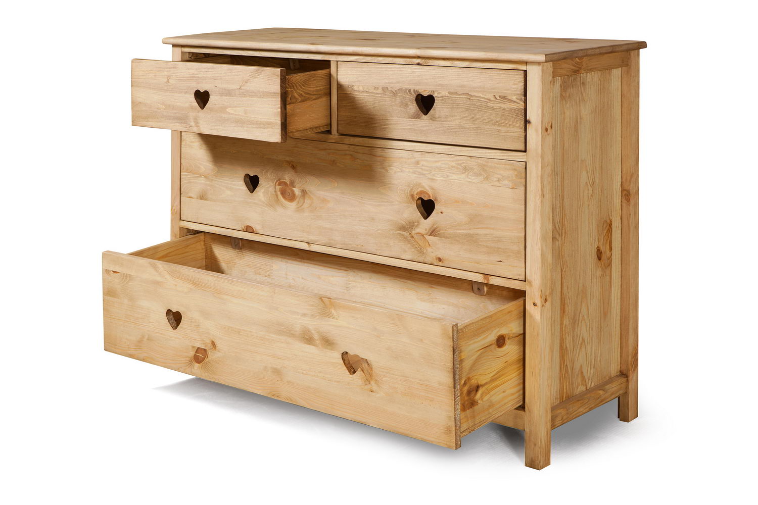 Корпус, ящики, полка и дверцы изготовлены из массива сосны.