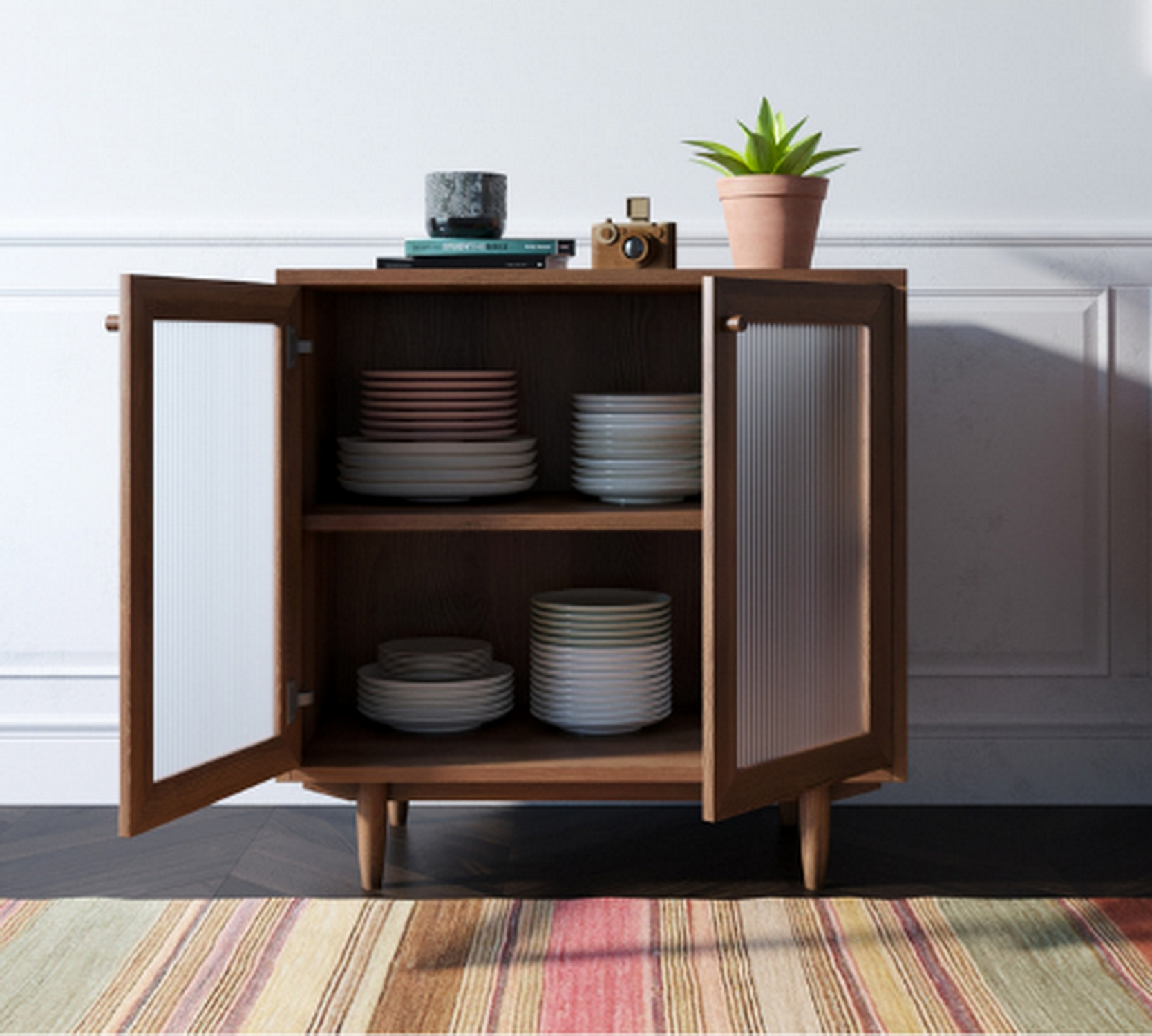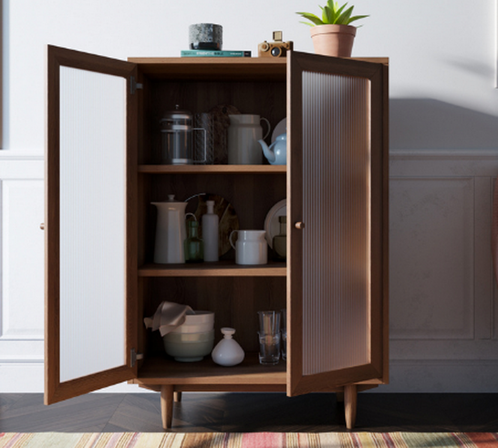 Дверцы тумб и шкафов украшены вставками из матового стекла. Коллекция разработана по модульной системе: комбинируя разные предметы, можно делить пространство на зоны. Производитель может изготовить предмет по размерам заказчика, выполнить окраску по RAL, оснастить дверцы доводчиками.